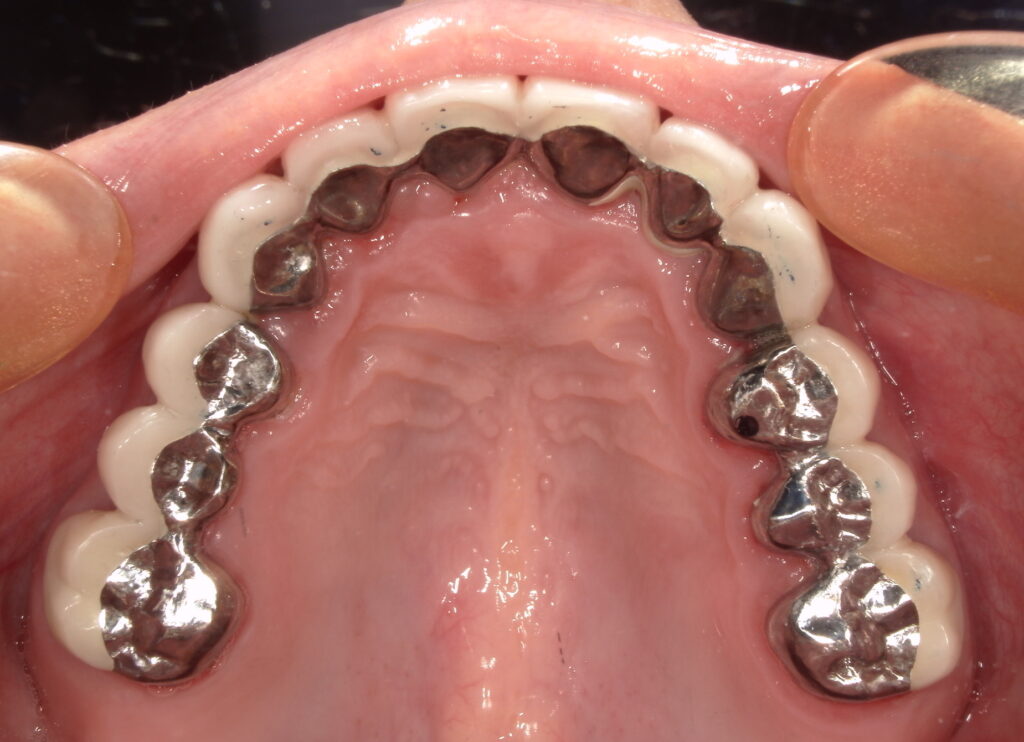 入れ歯を支えている6本の歯、内冠を被せ、その上から入れ歯部分の外冠を被せます。