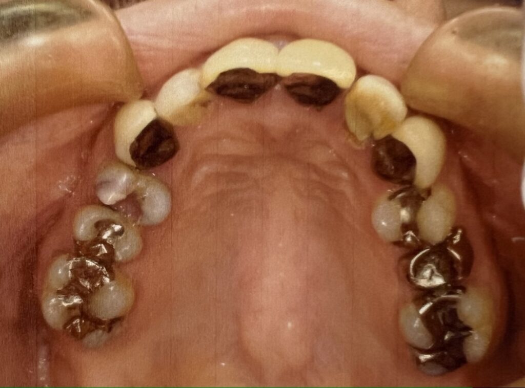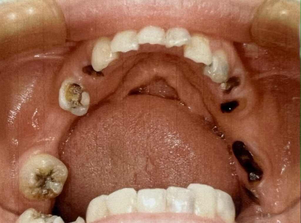 お口の中は虫歯が多く、特に上の歯はまず虫歯治療から一つひとつ丁寧に進めていく必要がありました。