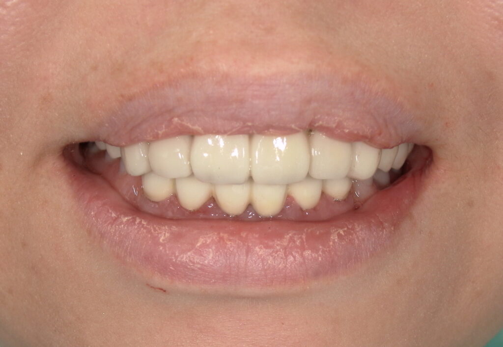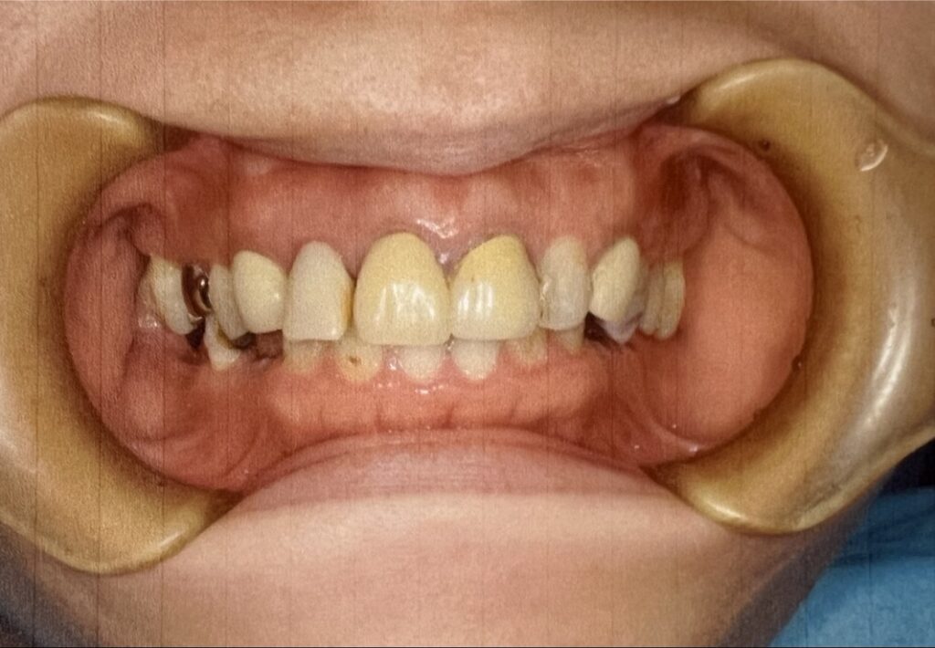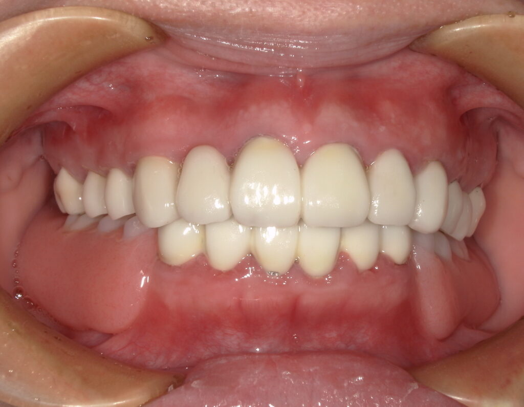 上の歯は、虫歯治療を行ったうえで、白い歯で前装し、全体的にブリッジ治療を行いました。