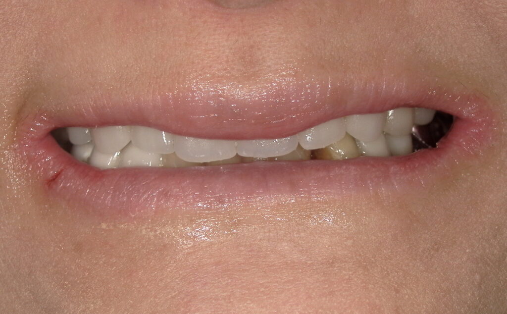 「歯の中心が自分の感覚と少し合っていないように感じます。口を閉じている時も、顎の力が抜けず、ずっと軽く噛みしめているような感覚があります。また、歯の色については、もう1段階か2段階くらい白い方が好みです。」